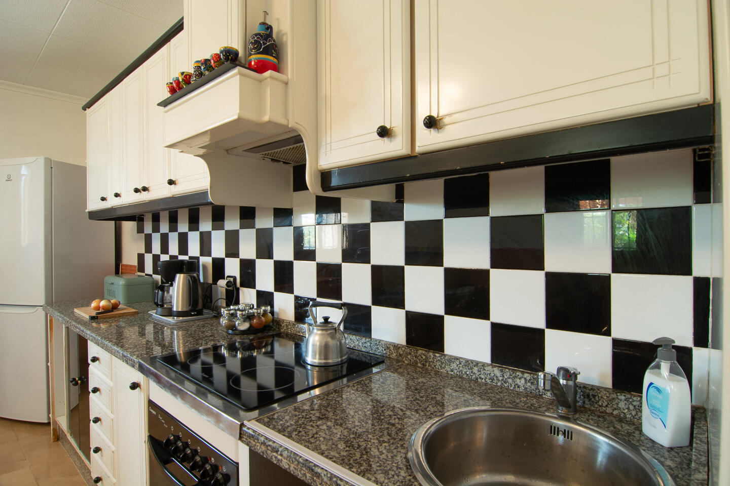 De open keuken is voorzien van een oven, koelkast met vriezer, koffieapparaat en waterkoker. In een aparte ruimte staat een wasmachine en droogrek.