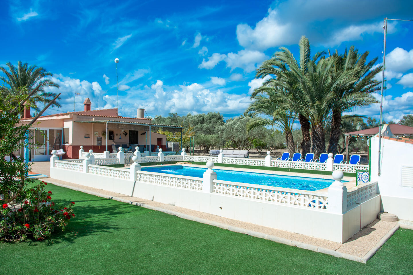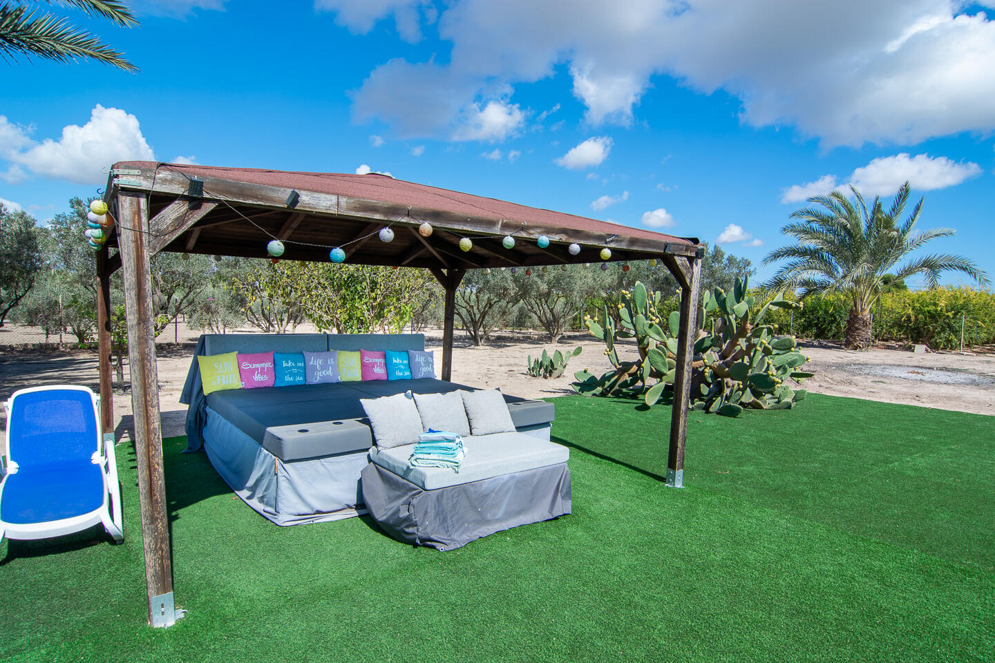 Er zijn ook schaduwplekjes onder de palmbomen. Er is een zonneweide met kunstgras, groot lounge-bed (2.40 x 2.40m), ligbedden en hangmatten rond het zwembad, inclusief een terras met BBQ en pizza-oven, om helemaal tot rust te komen of tot laat in de avond lekker te kunnen chillen.
